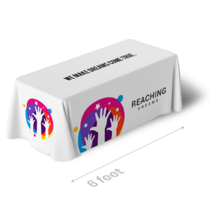 Print custom table covers for standard 6’ or 8′ tables at trade shows, conventions, and other indoor events.